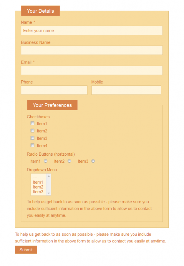 Mocha Mocha is a coffee inspired theme, which contains a range of darker and lighter browns. Your Mocha flavored forms will stand out on your website due to its clever use of contrast.