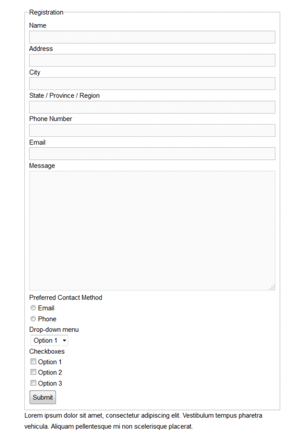 Registration The Registration template is the perfect template for gathering general registration information from your audience. Clear and concise, this template has everything you need to quickly have a registration form ready for your website. Included in this template are the following fields: – Title – Name – Address – City – State/Province/Region – Phone…